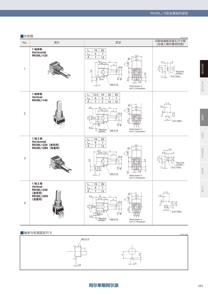 RK09L1120A0Z 照片 1軸 單聯(lián) Horizontal 螺紋固定 平軸 20mm 無(wú) 10kΩ 1B 9型