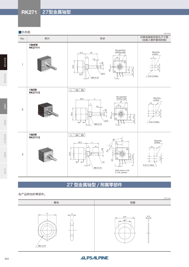 采購(gòu):RK271系列——ALPS金屬軸電位器