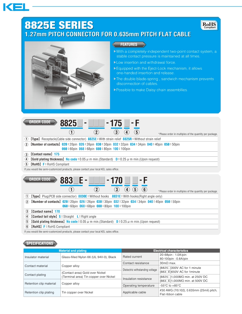 8825E系列是1.27mm間距的底板對線連接器。兼容 AWG#30扁平電纜。