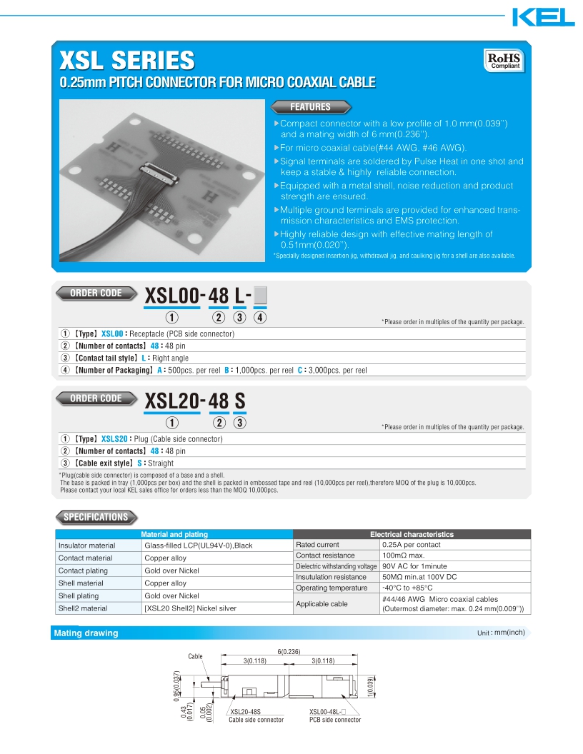 KEL極細(xì)同軸電纜連接器產(chǎn)品“XSL系列”是用于0.25毫米螺距微同軸線纜,XSL00-48L業(yè)界最低的產(chǎn)品的水平的連接器。用于微同軸線纜0.25毫米間距用連接器,AWG#4446,插座(基板側(cè)連接器),直角型,48個(gè)磁極,裝箱數(shù)3000。