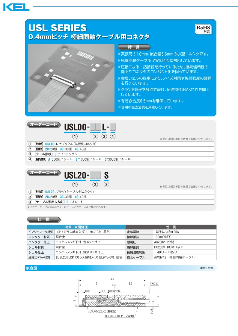 KEL線對板連接器,USL系列極細同軸電纜。“USL系列”是用于微同軸電纜(AWG#42)的0.4 mm間距絕緣位移連接器,USL系列超細同軸電纜用0.4mm間距IDC連接器,線對板連接器插座,直角,極數(shù)有20、30、40,包裝數(shù)量有500、1000、5000。主要用于照相機、攝像機、DV機、無人機等圖像傳輸、數(shù)據(jù)傳輸?shù)取?/span>
