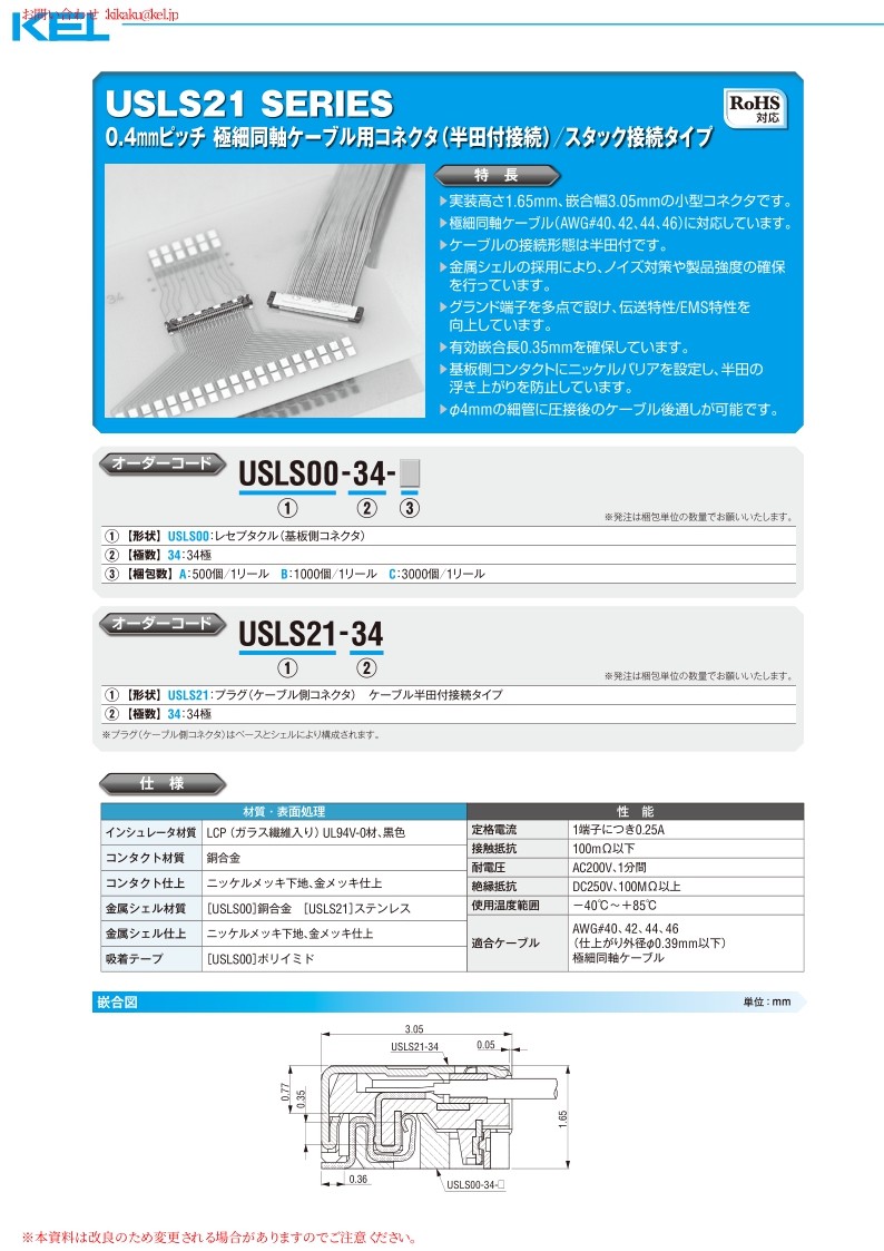 USLS21系列——KEL極細(xì)同軸電纜連接器