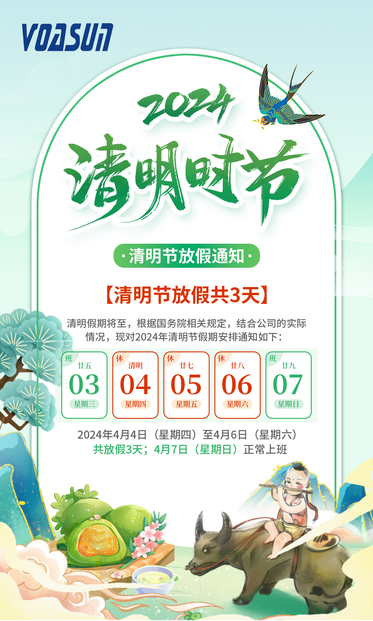 根據(jù)國(guó)家及公司相關(guān)規(guī)定,2024年清明節(jié)放假及調(diào)班安排:4月4日、5日、6日放假,共3天;4月7日(周日)上班。